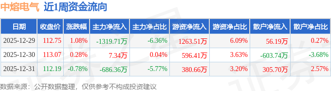 资金流向数据方面,本周中熔电气主力资金合计净流出1998.73万元,游资资金合计净流入2240.58万元,散户资金合计净流出241.85万元。本周资金流向一览见下表: