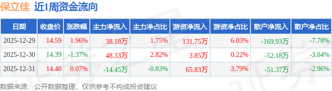 资金流向数据方面,本周保立佳主力资金合计净流入72.06万元,游资资金合计净流入201.42万元,散户资金合计净流出273.48万元。本周资金流向一览见下表:
