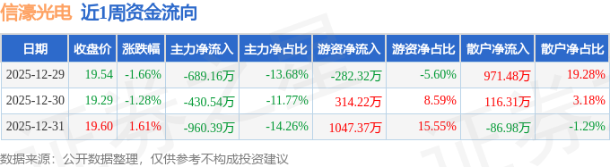 资金流向数据方面,本周信濠光电主力资金合计净流出2080.09万元,游资资金合计净流入1079.27万元,散户资金合计净流入1000.82万元。本周资金流向一览见下表: