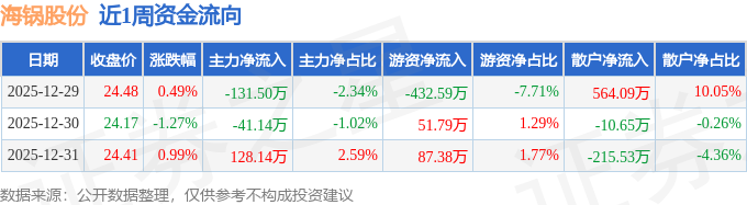 资金流向数据方面,本周海锅股份主力资金合计净流出44.5万元,游资资金合计净流出293.41万元,散户资金合计净流入337.91万元。本周资金流向一览见下表: