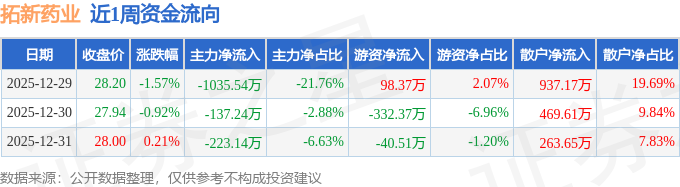 资金流向数据方面,本周拓新药业主力资金合计净流出1395.92万元,游资资金合计净流出274.5万元,散户资金合计净流入1670.42万元。本周资金流向一览见下表: