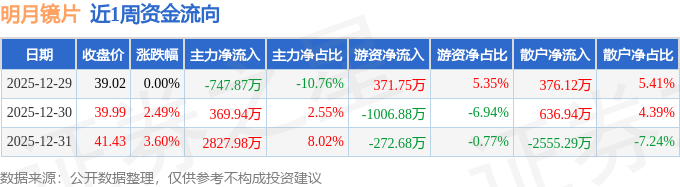 资金流向数据方面,本周明月镜片主力资金合计净流入2450.05万元,游资资金合计净流出907.81万元,散户资金合计净流出1542.24万元。本周资金流向一览见下表:
