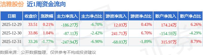 资金流向数据方面,本周洁雅股份主力资金合计净流出521.32万元,游资资金合计净流入185.7万元,散户资金合计净流入335.62万元。本周资金流向一览见下表: