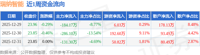 资金流向数据方面,本周瑞纳智能主力资金合计净流出601.56万元,游资资金合计净流入249.45万元,散户资金合计净流入352.11万元。本周资金流向一览见下表: