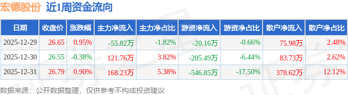 资金流向数据方面,本周宏德股份主力资金合计净流入234.16万元,游资资金合计净流出772.5万元,散户资金合计净流入538.34万元。本周资金流向一览见下表: