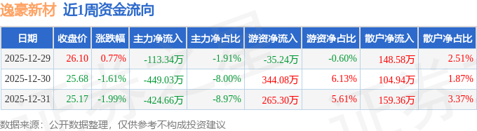 资金流向数据方面,本周逸豪新材主力资金合计净流出987.02万元,游资资金合计净流入574.14万元,散户资金合计净流入412.88万元。本周资金流向一览见下表: