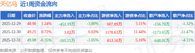 资金流向数据方面,本周天亿马主力资金合计净流出613.33万元,游资资金合计净流入2591.68万元,散户资金合计净流出1978.35万元。本周资金流向一览见下表:
