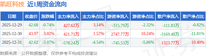 资金流向数据方面,本周凯旺科技主力资金合计净流入271.1万元,游资资金合计净流入1686.45万元,散户资金合计净流出1957.55万元。本周资金流向一览见下表:
