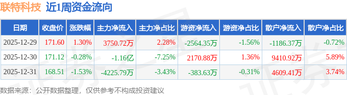 资金流向数据方面,本周联特科技主力资金合计净流出1.21亿元,游资资金合计净流出777.09万元,散户资金合计净流入1.28亿元。本周资金流向一览见下表: