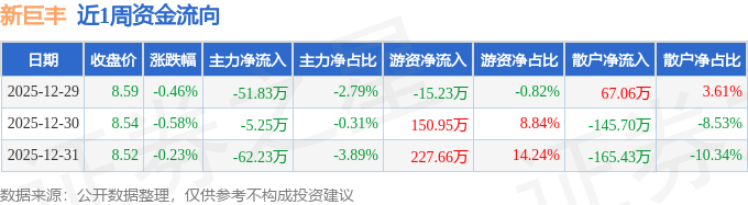 资金流向数据方面,本周新巨丰主力资金合计净流出119.3万元,游资资金合计净流入363.38万元,散户资金合计净流出244.08万元。本周资金流向一览见下表: