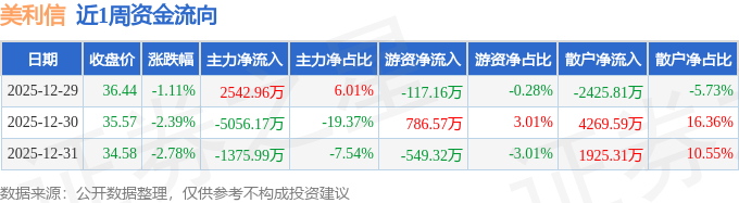 资金流向数据方面,本周美利信主力资金合计净流出3889.19万元,游资资金合计净流入120.09万元,散户资金合计净流入3769.1万元。本周资金流向一览见下表: