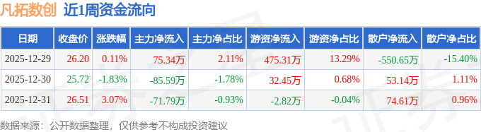 资金流向数据方面,本周凡拓数创主力资金合计净流出82.03万元,游资资金合计净流入504.94万元,散户资金合计净流出422.91万元。本周资金流向一览见下表: