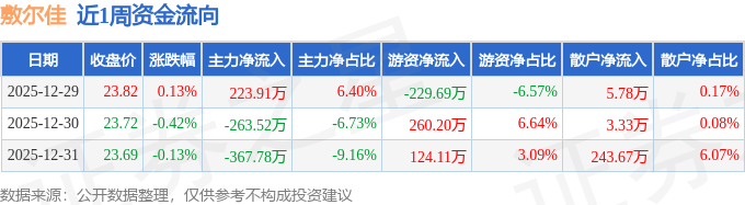 资金流向数据方面,本周敷尔佳主力资金合计净流出407.4万元,游资资金合计净流入154.62万元,散户资金合计净流入252.78万元。本周资金流向一览见下表:
