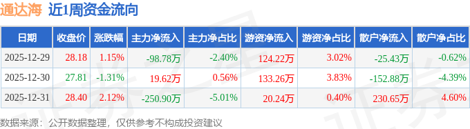 资金流向数据方面,本周通达海主力资金合计净流出330.06万元,游资资金合计净流入277.72万元,散户资金合计净流入52.34万元。本周资金流向一览见下表: