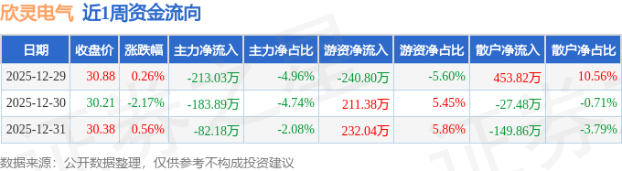 证券之星消息,截至2025年12月31日收盘,欣灵电气(301388)报收于30.38元,较上周的30.8元下跌1.36%。本周,欣灵电气12月29日盘中最高价报31.11元。12月31日盘中最低价报30.02元。欣灵电气当前最新总市值31.12亿元,在电网设备板块市值排名113/123,在两市A股市值排名4464/5181。