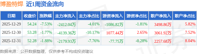 资金流向数据方面,本周博盈特焊主力资金合计净流出8731.34万元,游资资金合计净流出87.13万元,散户资金合计净流入8818.47万元。本周资金流向一览见下表: