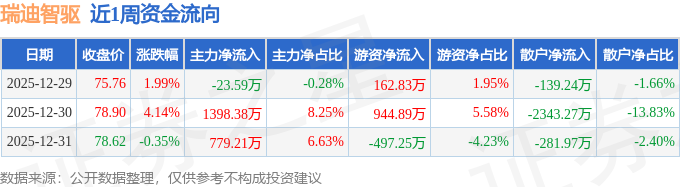 资金流向数据方面,本周瑞迪智驱主力资金合计净流入2154.01万元,游资资金合计净流入610.47万元,散户资金合计净流出2764.48万元。本周资金流向一览见下表: