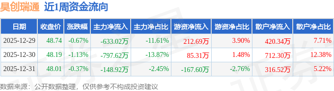 证券之星消息,截至2025年12月31日收盘,昊创瑞通(301668)报收于48.01元,较上周的49.07元下跌2.16%。本周,昊创瑞通12月29日盘中最高价报49.36元。12月31日盘中最低价报47.4元,股价触及近一年最低点。昊创瑞通当前最新总市值52.81亿元,在电网设备板块市值排名70/123,在两市A股市值排名3202/5181。