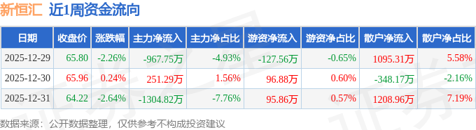 资金流向数据方面,本周新恒汇主力资金合计净流出2021.28万元,游资资金合计净流入65.18万元,散户资金合计净流入1956.1万元。本周资金流向一览见下表: