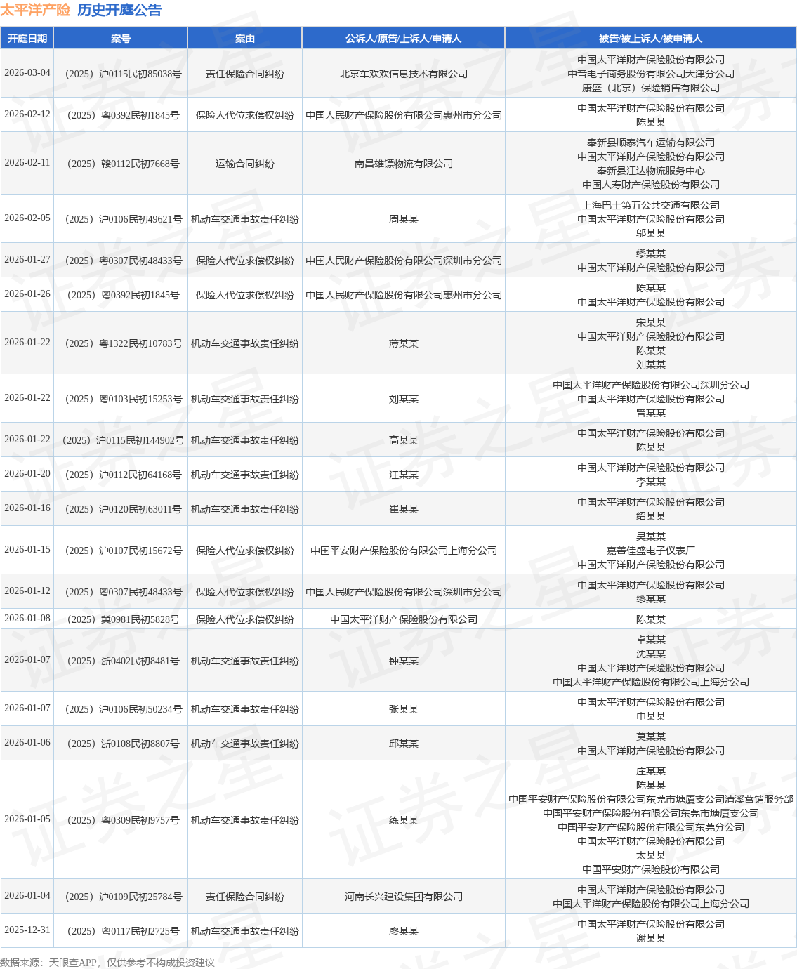 案号:(2025)粤0309民初9757号根据统计,近一年内以中国太平洋财产保险股份有限公司为当事人的历史开庭公告有684则,其中案由为“机动车交通事故责任纠纷”的公告以446则居首,其次为“保险人代位求偿权纠纷”有79则,“非机动车交通事故责任纠纷”有28则。历史开庭公告(前20条)如下: