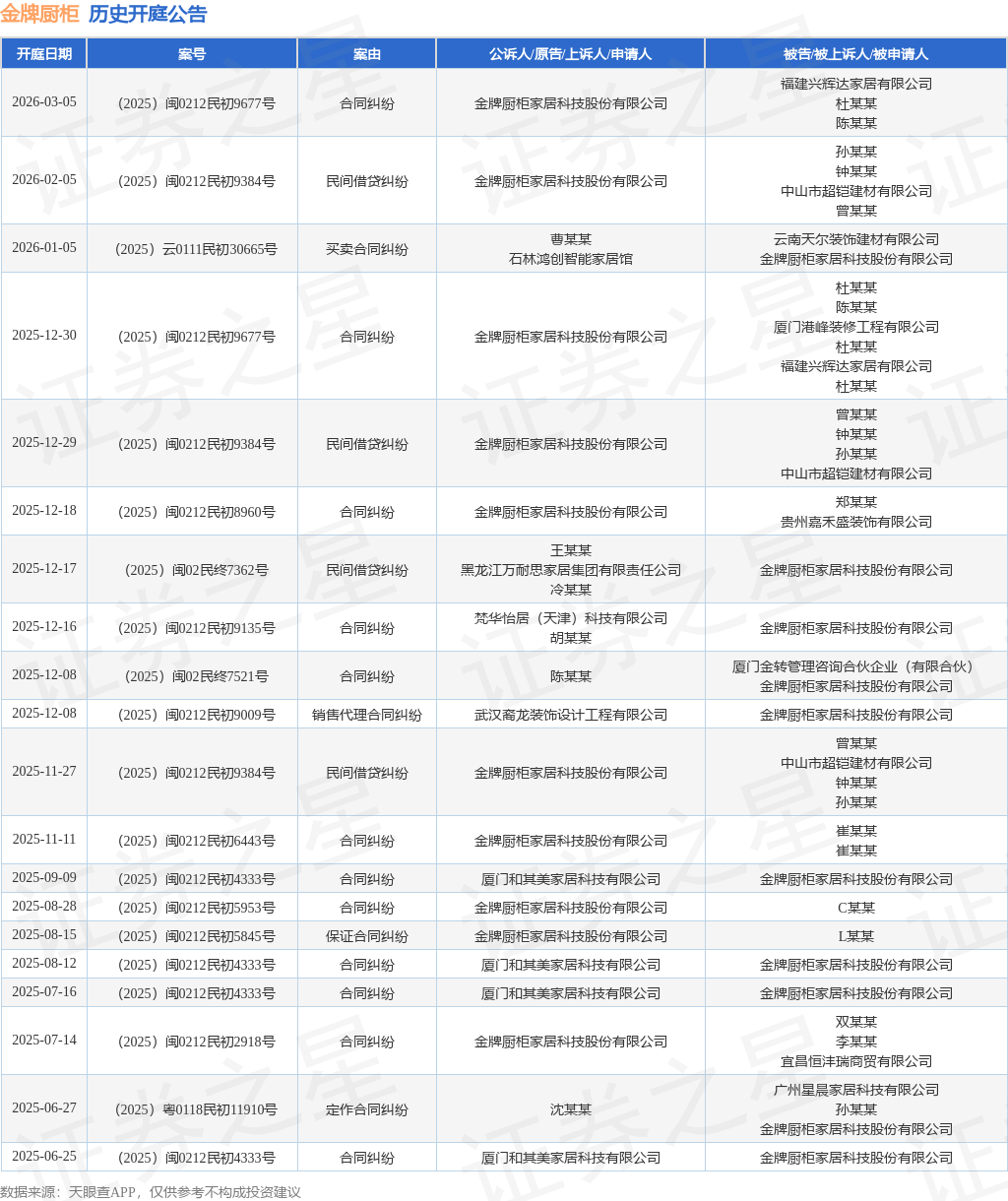 案号:(2025)云0111民初30665号根据统计,近一年内以金牌厨柜家居科技股份有限公司为当事人的历史开庭公告有31则,其中案由为“合同纠纷”的公告以17则居首,其次为“定作合同纠纷”有4则,“民间借贷纠纷”有4则。历史开庭公告(前20条)如下: