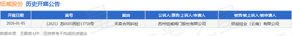 证券之星消息,根据天眼查APP显示,近日公布了一则苏州纽威阀门股份有限公司作为原告/上诉人的开庭公告,详细内容如下: