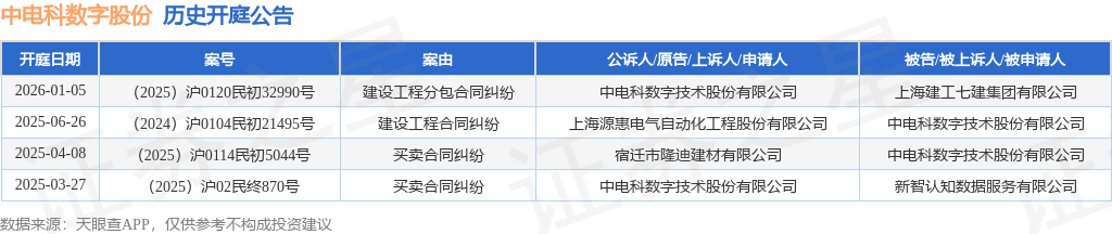 案号:(2025)沪0120民初32990号根据统计,近一年内以中电科数字技术股份有限公司为当事人的历史开庭公告有4则,其中案由为“买卖合同纠纷”的公告以2则居首,其次为“建设工程分包合同纠纷”有1则,“建设工程合同纠纷”有1则。历史开庭公告如下:
