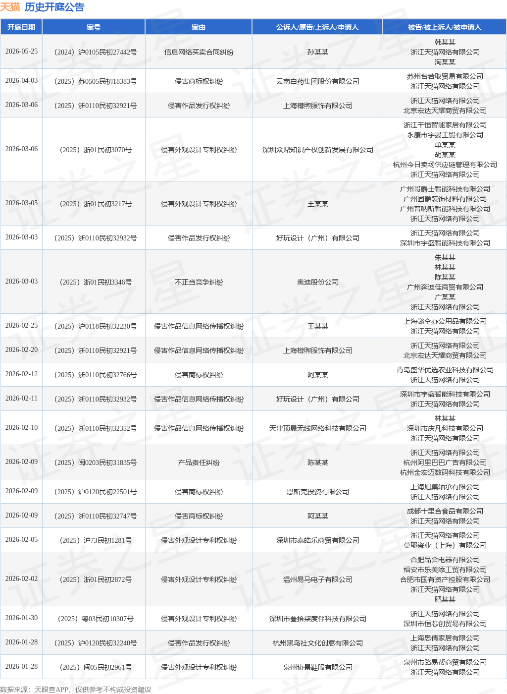案号:(2025)粤0304民初8726号根据统计,近一年内以浙江天猫网络有限公司为当事人的历史开庭公告有2026则,其中案由为“著作权权属、侵权纠纷”的公告以427则居首,其次为“侵害外观设计专利权纠纷”有312则,“侵害商标权纠纷”有304则。历史开庭公告(前20条)如下: