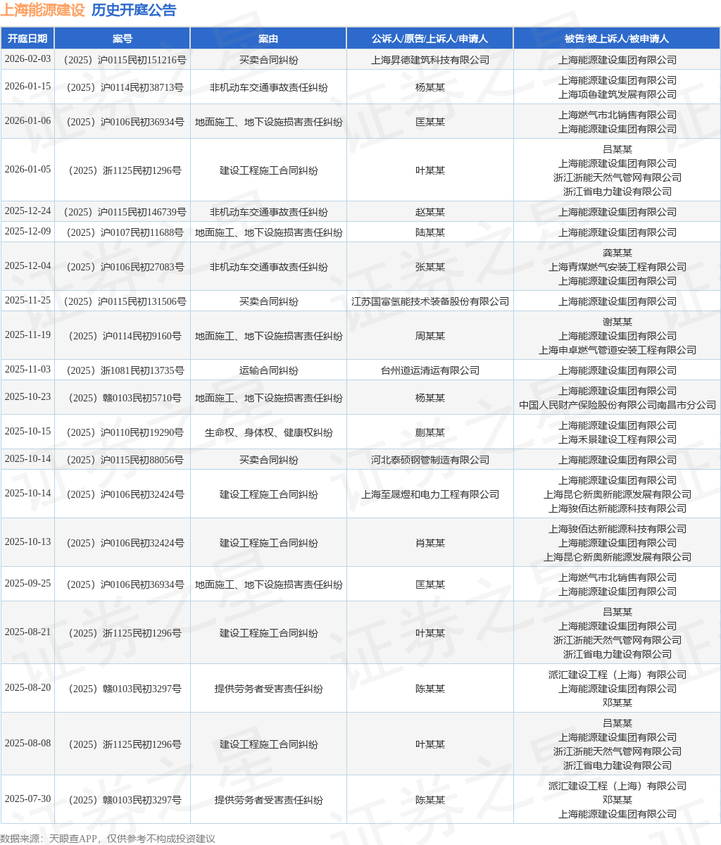 案号:(2025)浙1125民初1296号根据统计,近一年内以上海能源建设集团有限公司为当事人的历史开庭公告有44则,其中案由为“建设工程施工合同纠纷”的公告以10则居首,其次为“地面施工、地下设施损害责任纠纷”有7则,“买卖合同纠纷”有6则。历史开庭公告(前20条)如下: