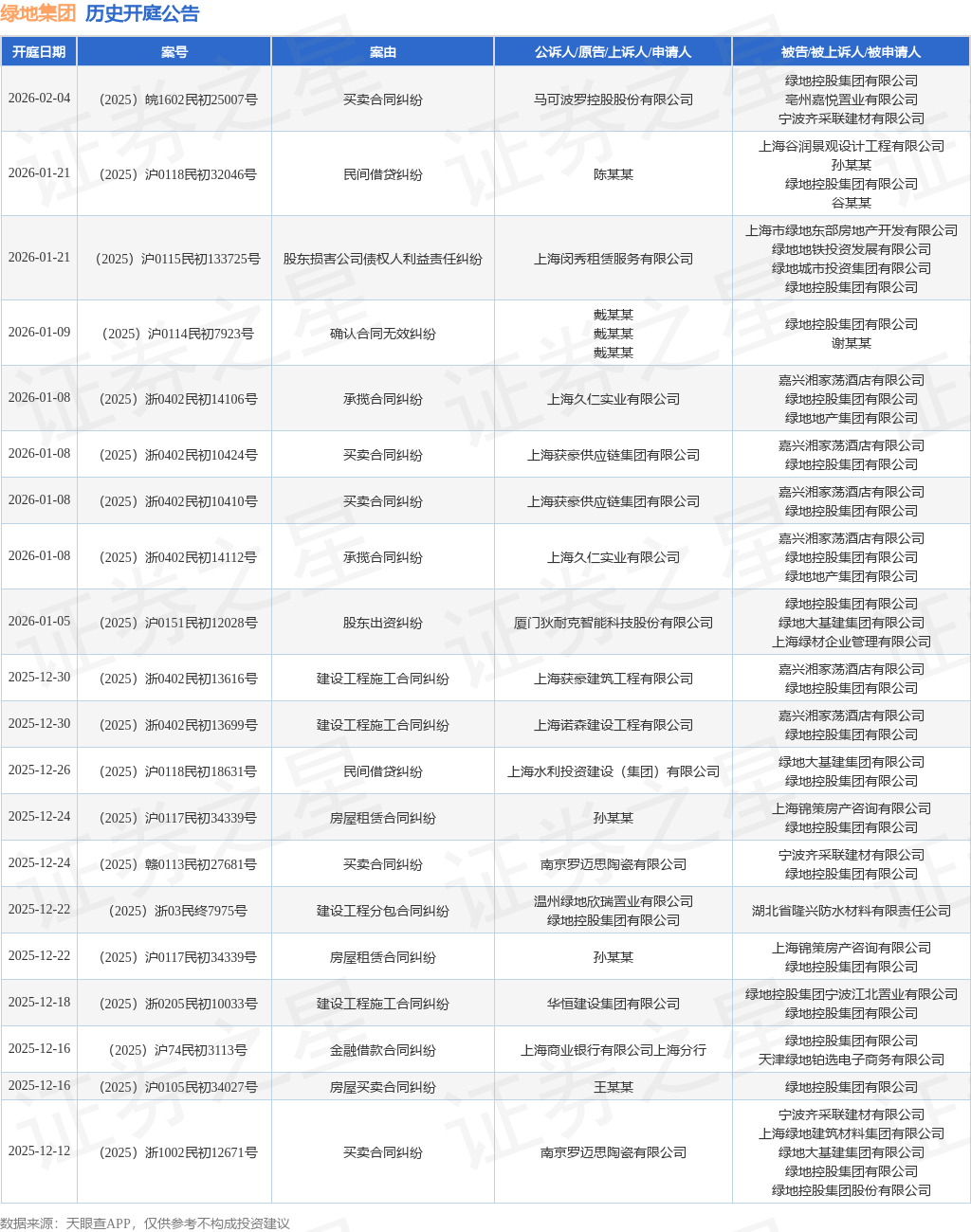 案号:(2025)沪0151民初12028号根据统计,近一年内以绿地控股集团有限公司为当事人的历史开庭公告有211则,其中案由为“建设工程施工合同纠纷”的公告以43则居首,其次为“金融借款合同纠纷”有24则,“合同纠纷”有18则。历史开庭公告(前20条)如下: