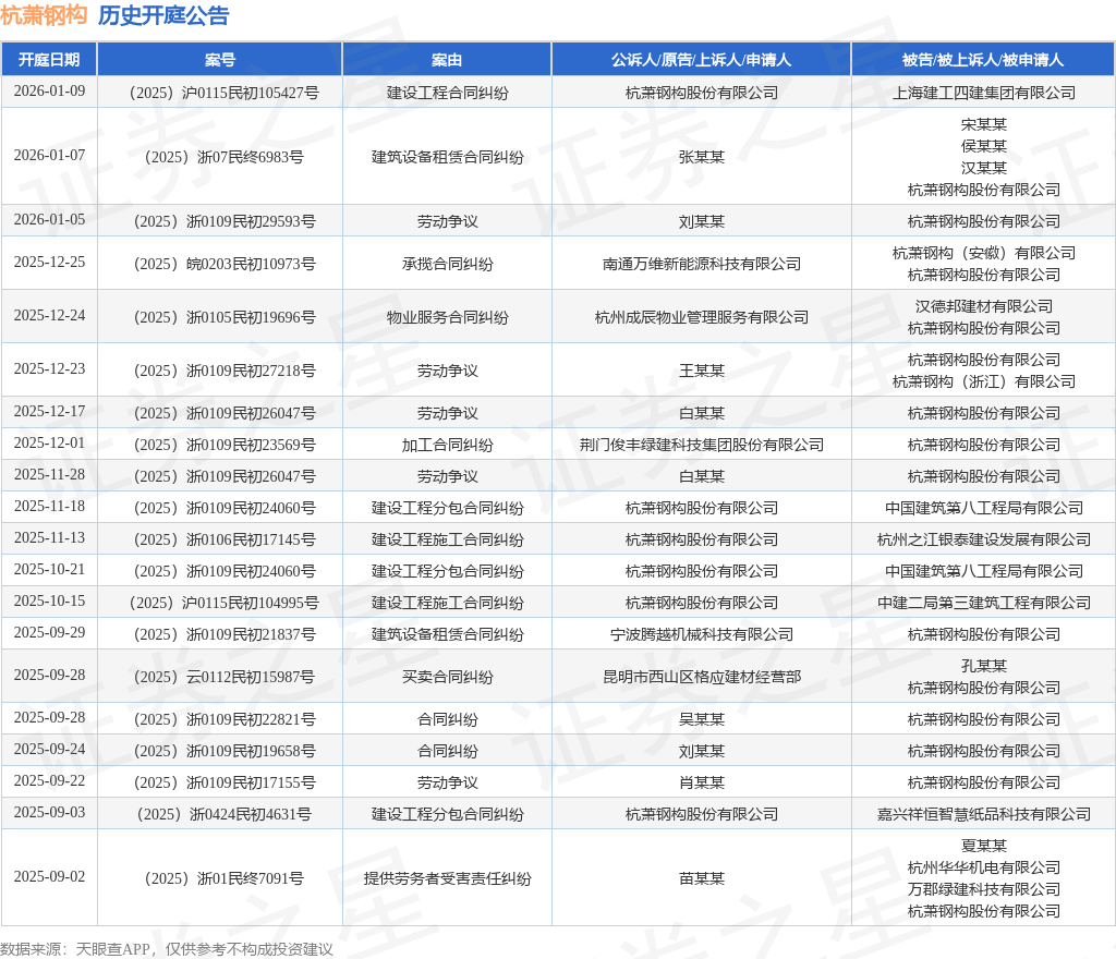 案号:(2025)浙0109民初29593号根据统计,近一年内以杭萧钢构股份有限公司为当事人的历史开庭公告有36则,其中案由为“劳动争议”的公告以6则居首,其次为“建筑设备租赁合同纠纷”有5则,“建设工程分包合同纠纷”有5则。历史开庭公告(前20条)如下: