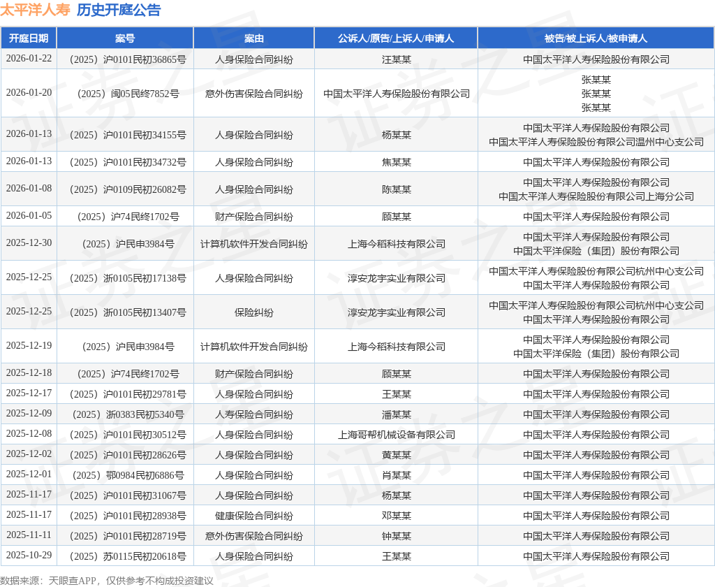 案号:(2025)沪74民终1702号根据统计,近一年内以中国太平洋人寿保险股份有限公司为当事人的历史开庭公告有143则,其中案由为“人身保险合同纠纷”的公告以91则居首,其次为“意外伤害保险合同纠纷”有15则,“保险纠纷”有12则。历史开庭公告(前20条)如下: