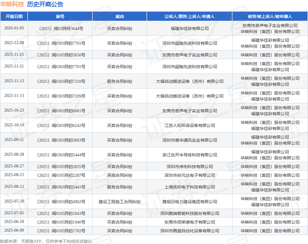 案号:(2025)闽03民终3644号根据统计,近一年内以华映科技(集团)股份有限公司为当事人的历史开庭公告有17则,其中案由为“买卖合同纠纷”的公告以13则居首,其次为“服务合同纠纷”有2则,“建设工程施工合同纠纷”有1则。历史开庭公告如下: