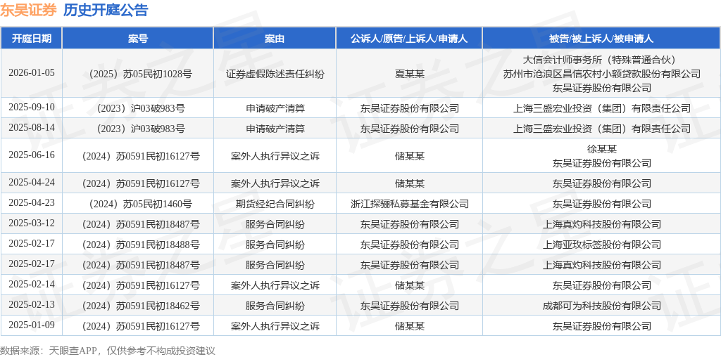根据统计,近一年内以东吴证券股份有限公司为当事人的历史开庭公告有12则,其中案由为“服务合同纠纷”的公告以4则居首,其次为“案外人执行异议之诉”有4则,“申请破产清算”有2则。历史开庭公告如下: