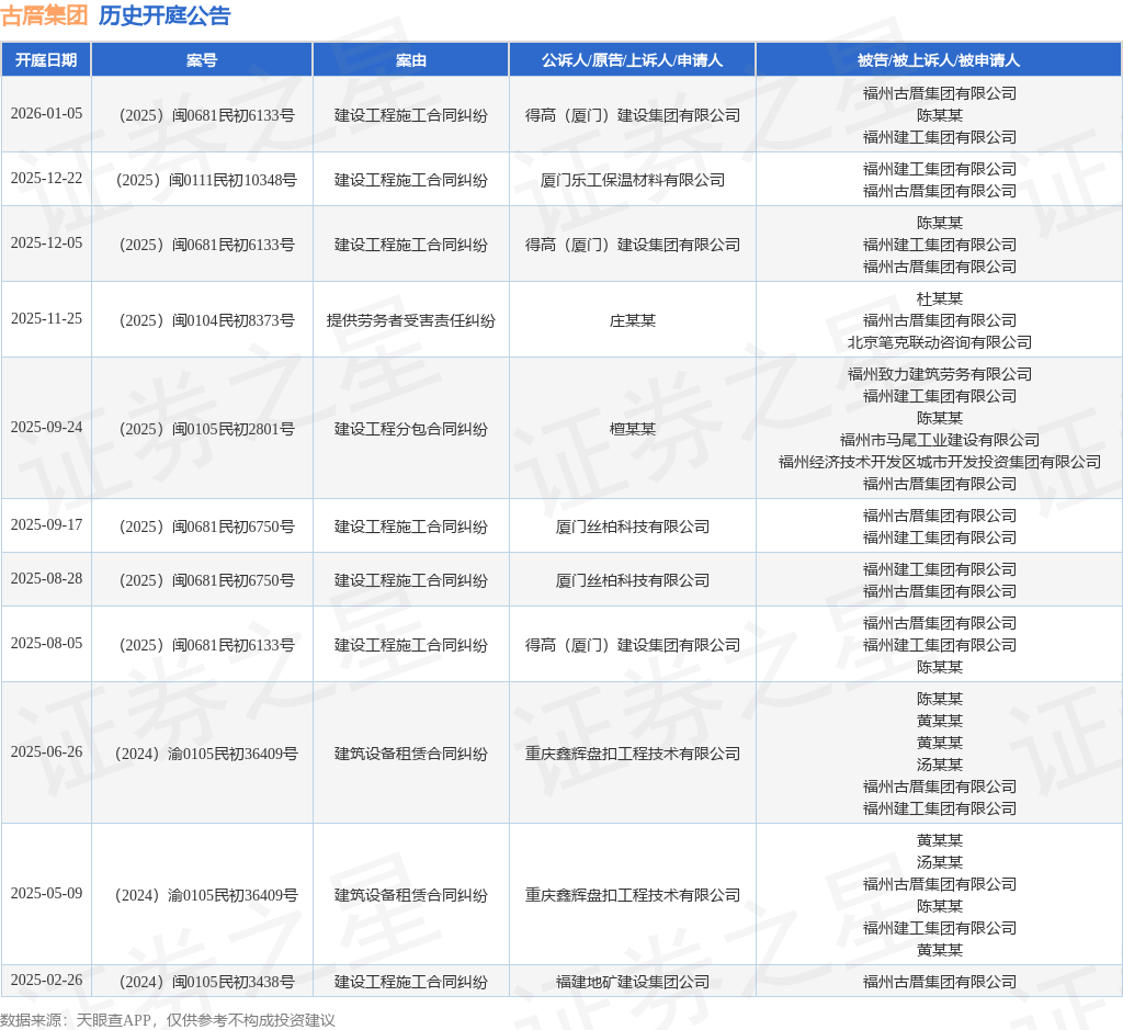 案号:(2025)闽0681民初6133号根据统计,近一年内以福州古厝集团有限公司为当事人的历史开庭公告有11则,其中案由为“建设工程施工合同纠纷”的公告以7则居首,其次为“建筑设备租赁合同纠纷”有2则,“建设工程分包合同纠纷”有1则。历史开庭公告如下: