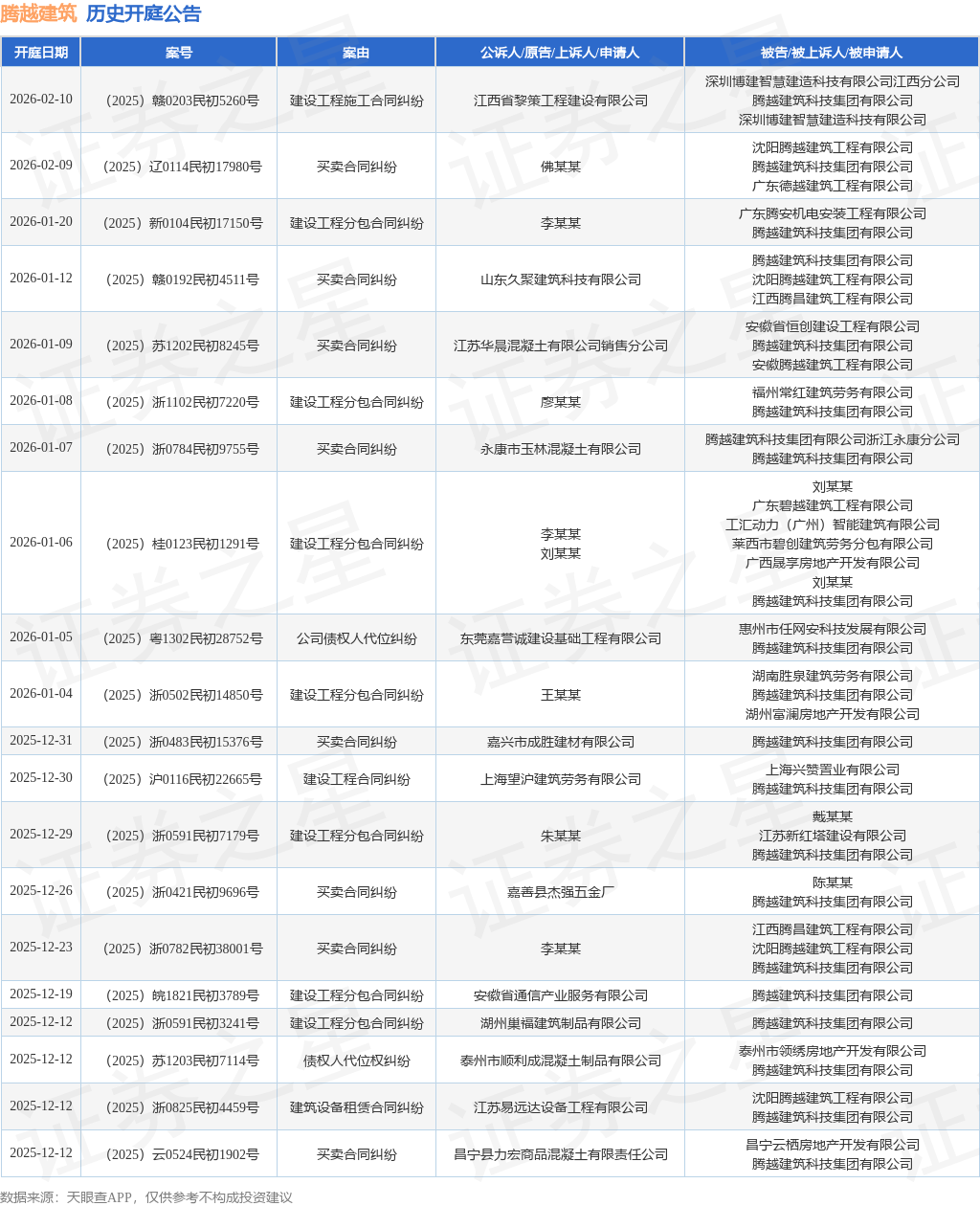 案号:(2025)粤1302民初28752号根据统计,近一年内以腾越建筑科技集团有限公司为当事人的历史开庭公告有374则,其中案由为“买卖合同纠纷”的公告以77则居首,其次为“建设工程施工合同纠纷”有66则,“建设工程分包合同纠纷”有57则。历史开庭公告(前20条)如下: