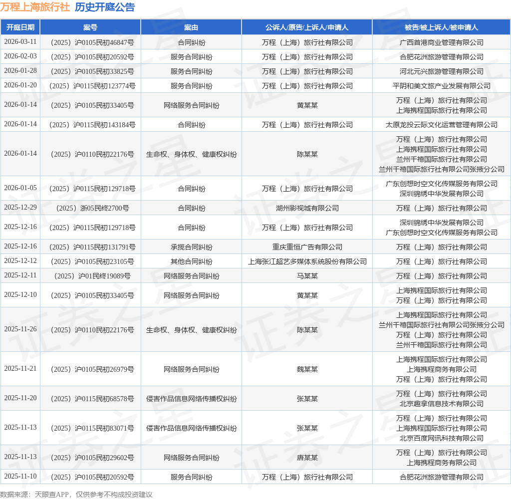 案号:(2025)沪0115民初129718号根据统计,近一年内以万程(上海)旅行社有限公司为当事人的历史开庭公告有67则,其中案由为“网络服务合同纠纷”的公告以26则居首,其次为“服务合同纠纷”有17则,“合同纠纷”有14则。历史开庭公告(前20条)如下: