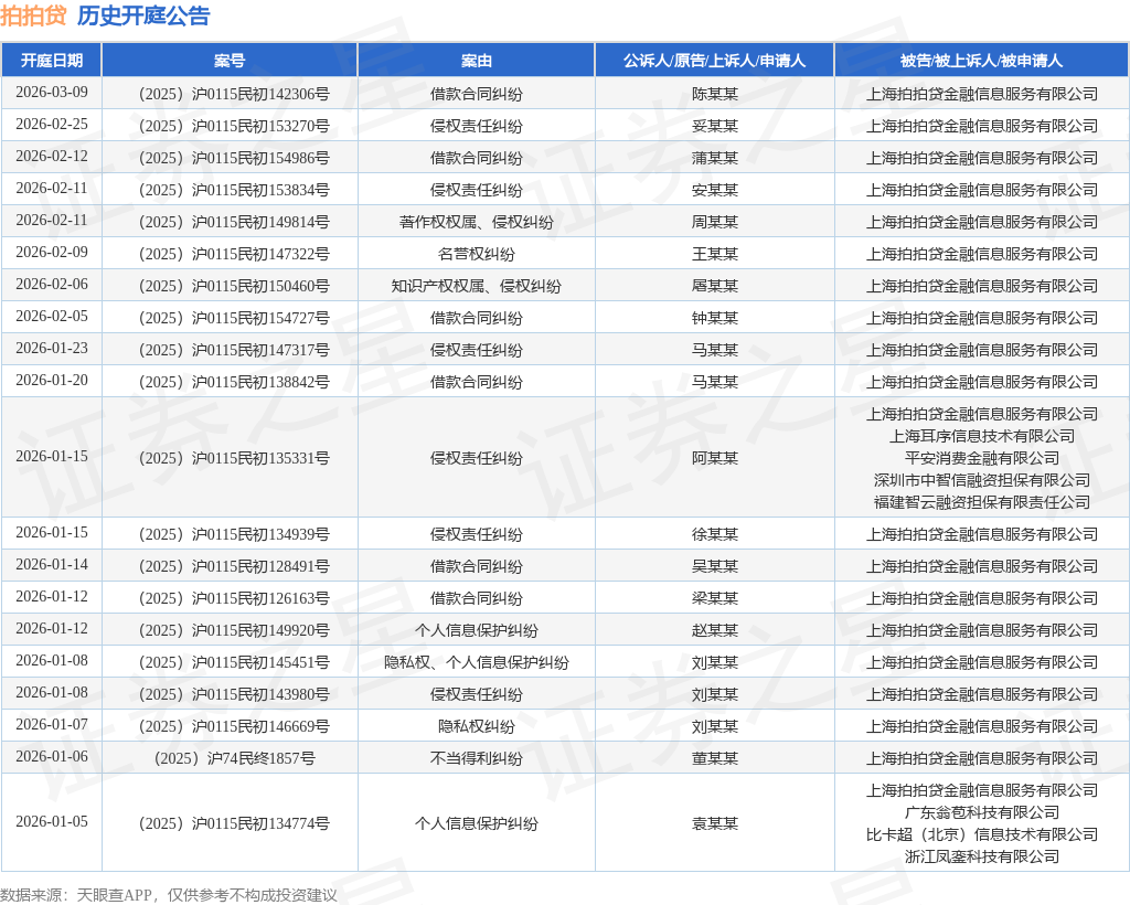 案号:(2025)沪0115民初134774号根据统计,近一年内以上海拍拍贷金融信息服务有限公司为当事人的历史开庭公告有108则,其中案由为“借款合同纠纷”的公告以26则居首,其次为“侵权责任纠纷”有23则,“个人信息保护纠纷”有15则。历史开庭公告(前20条)如下: