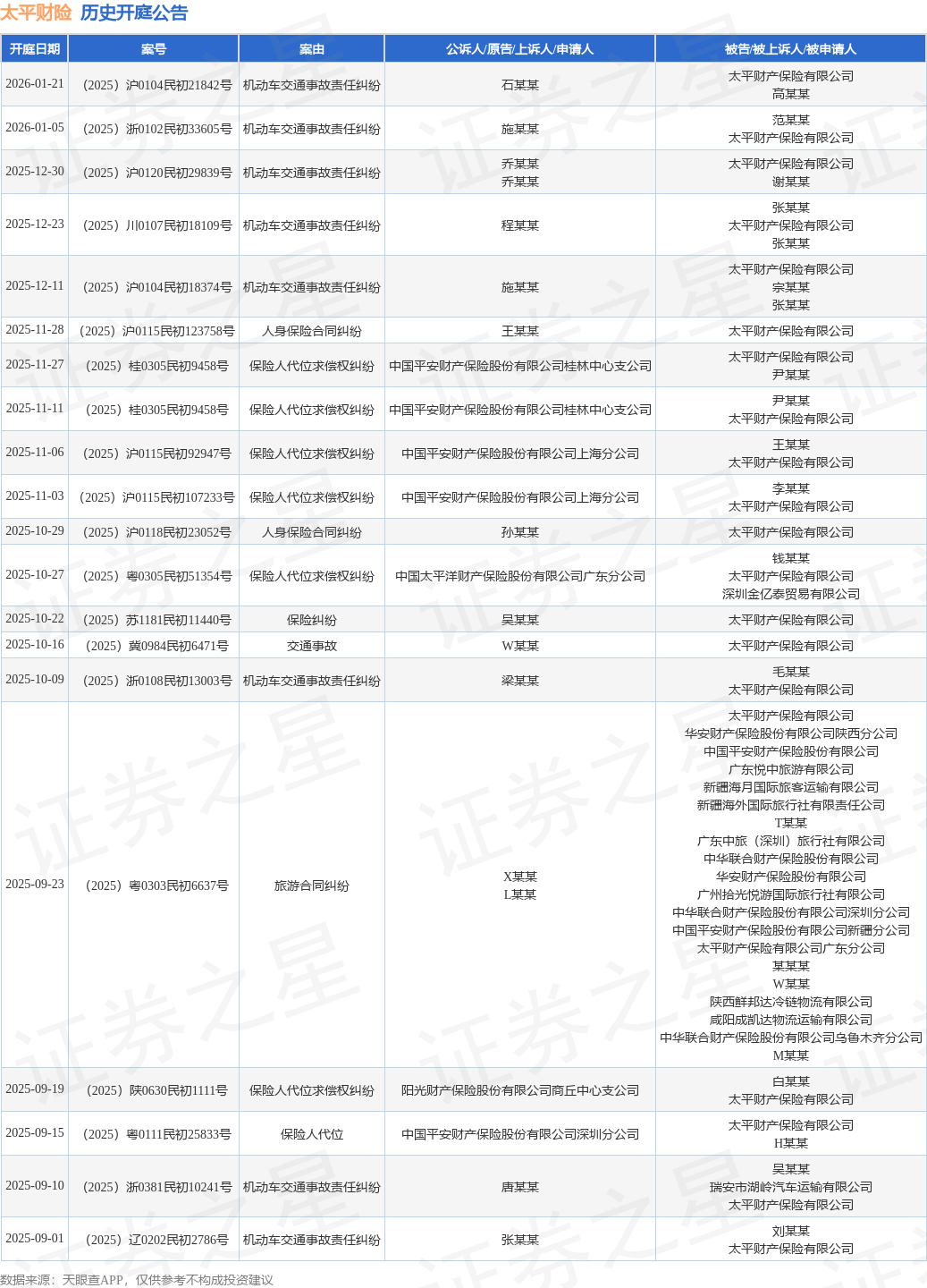 案号:(2025)浙0102民初33605号根据统计,近一年内以太平财产保险有限公司为当事人的历史开庭公告有132则,其中案由为“机动车交通事故责任纠纷”的公告以79则居首,其次为“保险人代位求偿权纠纷”有19则,“人身保险合同纠纷”有9则。历史开庭公告(前20条)如下: