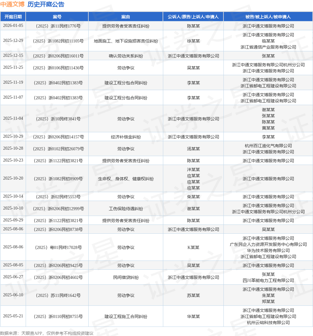 案号:(2025)浙11民终1776号根据统计,近一年内以浙江中通文博服务有限公司为当事人的历史开庭公告有21则,其中案由为“劳动争议”的公告以9则居首,其次为“提供劳务者受害责任纠纷”有3则,“建设工程分包合同纠纷”有2则。历史开庭公告(前20条)如下: