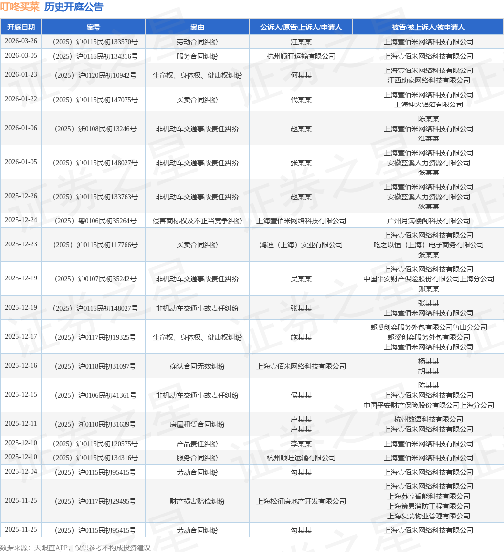 案号:(2025)沪0115民初148027号根据统计,近一年内以上海壹佰米网络科技有限公司为当事人的历史开庭公告有120则,其中案由为“非机动车交通事故责任纠纷”的公告以48则居首,其次为“劳动争议”有12则,“房屋租赁合同纠纷”有9则。历史开庭公告(前20条)如下: