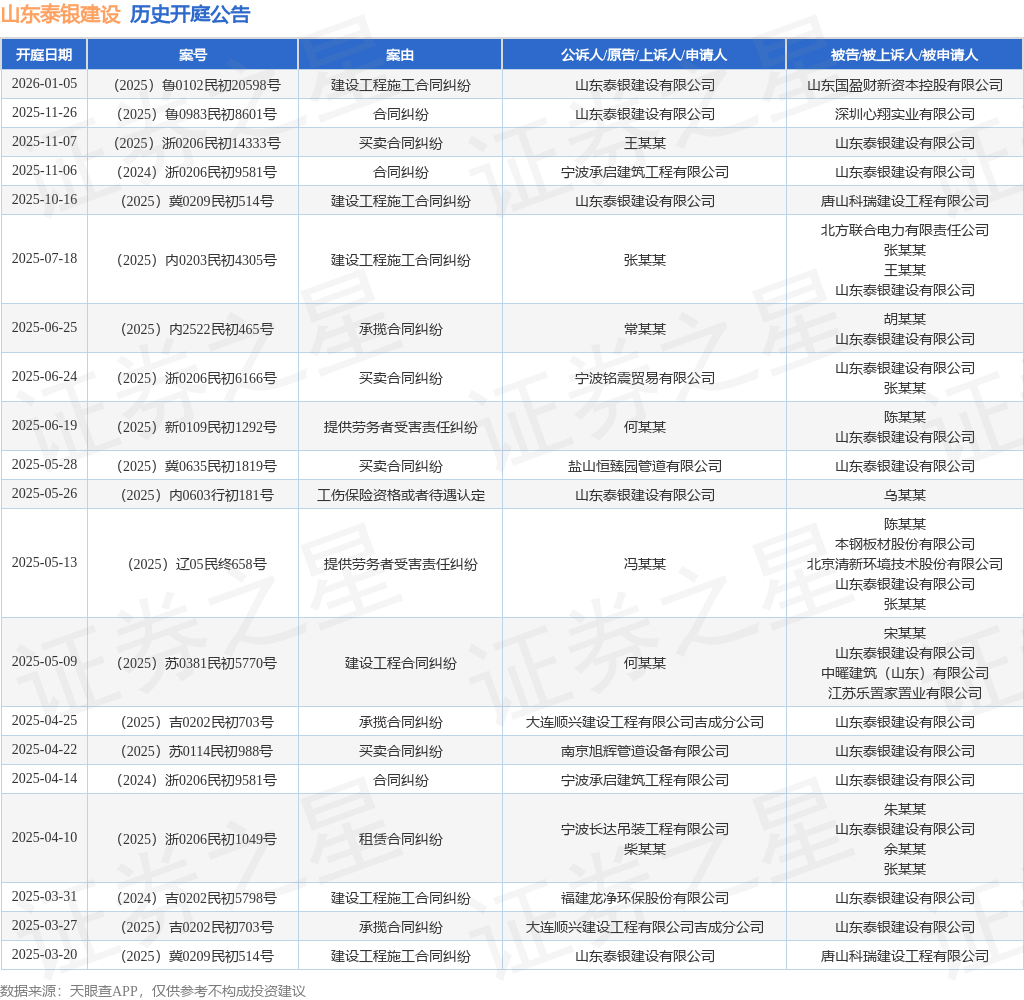 案号:(2025)鲁0102民初20598号根据统计,近一年内以山东泰银建设有限公司为当事人的历史开庭公告有52则,其中案由为“追索劳动报酬纠纷”的公告以15则居首,其次为“建设工程施工合同纠纷”有9则,“承揽合同纠纷”有7则。历史开庭公告(前20条)如下: