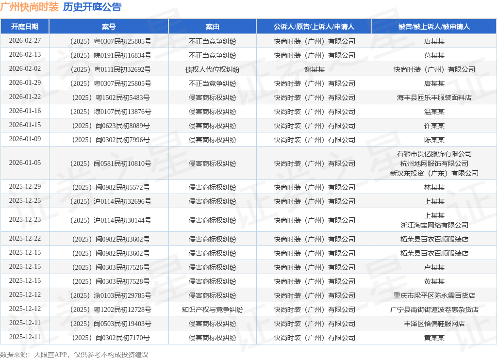 案号:(2025)闽0581民初10810号根据统计,近一年内以快尚时装(广州)有限公司为当事人的历史开庭公告有167则,其中案由为“侵害商标权纠纷”的公告以132则居首,其次为“商标权权属、侵权纠纷”有8则,“侵害商标权”有7则。历史开庭公告(前20条)如下: