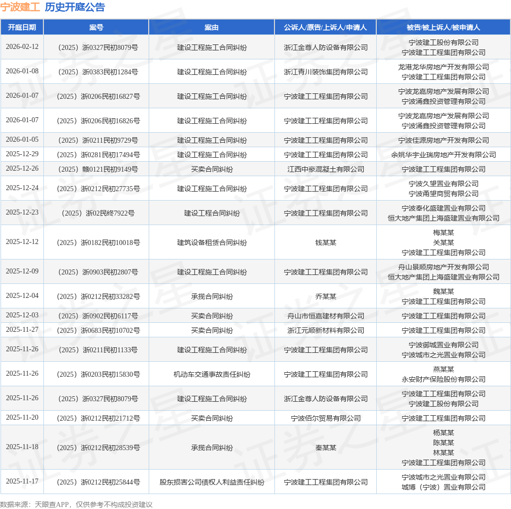 案号:(2025)浙0211民初9729号根据统计,近一年内以宁波建工工程集团有限公司为当事人的历史开庭公告有136则,其中案由为“建设工程施工合同纠纷”的公告以40则居首,其次为“买卖合同纠纷”有29则,“建设工程合同纠纷”有19则。历史开庭公告(前20条)如下: