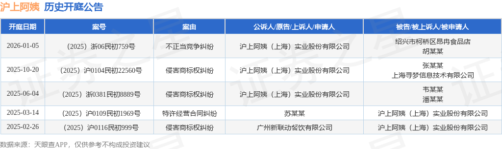 案号:(2025)浙06民初759号根据统计,近一年内以沪上阿姨(上海)实业股份有限公司为当事人的历史开庭公告有5则,其中案由为“侵害商标权纠纷”的公告以3则居首,其次为“不正当竞争纠纷”有1则,“特许经营合同纠纷”有1则。历史开庭公告如下: