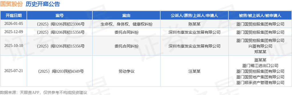 证券之星消息,根据天眼查APP显示,近日公布了一则厦门国贸控股集团有限公司作为被告/被上诉人的开庭公告,详细内容如下: