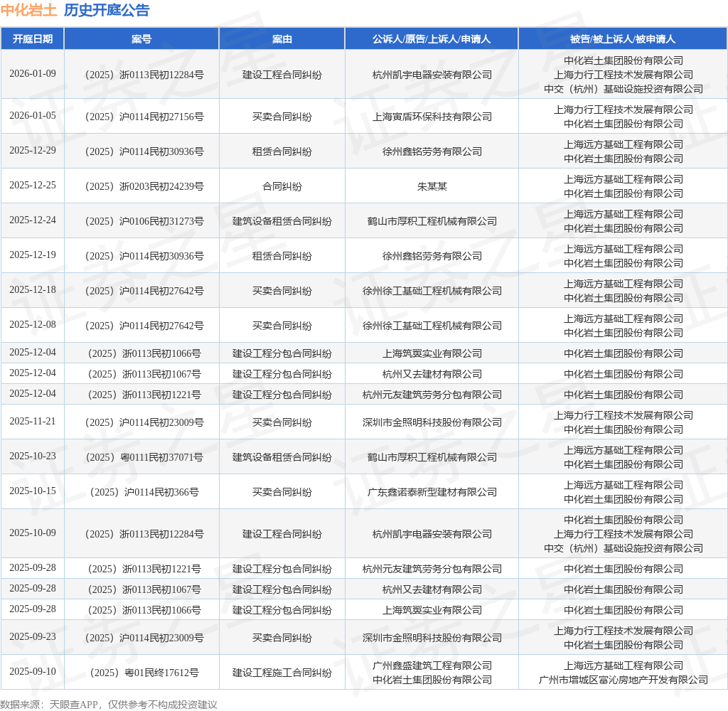 案号:(2025)沪0114民初27156号根据统计,近一年内以中化岩土集团股份有限公司为当事人的历史开庭公告有50则,其中案由为“买卖合同纠纷”的公告以12则居首,其次为“建设工程分包合同纠纷”有11则,“建设工程合同纠纷”有9则。历史开庭公告(前20条)如下: