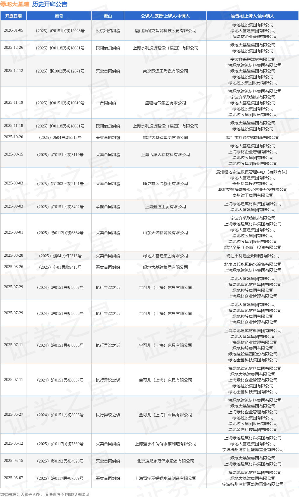 案号:(2025)沪0151民初12028号根据统计,近一年内以绿地大基建集团有限公司为当事人的历史开庭公告有24则,其中案由为“买卖合同纠纷”的公告以12则居首,其次为“执行异议之诉”有5则,“建设工程分包合同纠纷”有2则。历史开庭公告(前20条)如下: