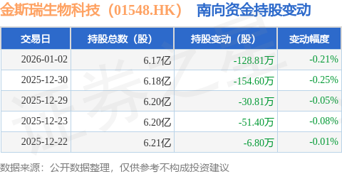 证券之星消息,1月2日南向资金减持128.81万股金斯瑞生物科技(01548.HK)。近5个交易日中,获南向资金减持的有5天,累计净减持372.41万股。近20个交易日中,获南向资金减持的有19天,累计净减持2574.21万股。截至目前,南向资金持有金斯瑞生物科技(01548.HK)6.17亿股,占公司已发行普通股的28.21%。