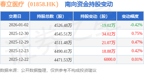 证券之星消息,1月2日南向资金减持19.02万股春立医疗(01858.HK)。近5个交易日中,获南向资金增持的有4天,累计净增持55.55万股。近20个交易日中,获南向资金增持的有14天,累计净增持136.18万股。截至目前,南向资金持有春立医疗(01858.HK)4526.48万股,占公司已发行普通股的47.57%。